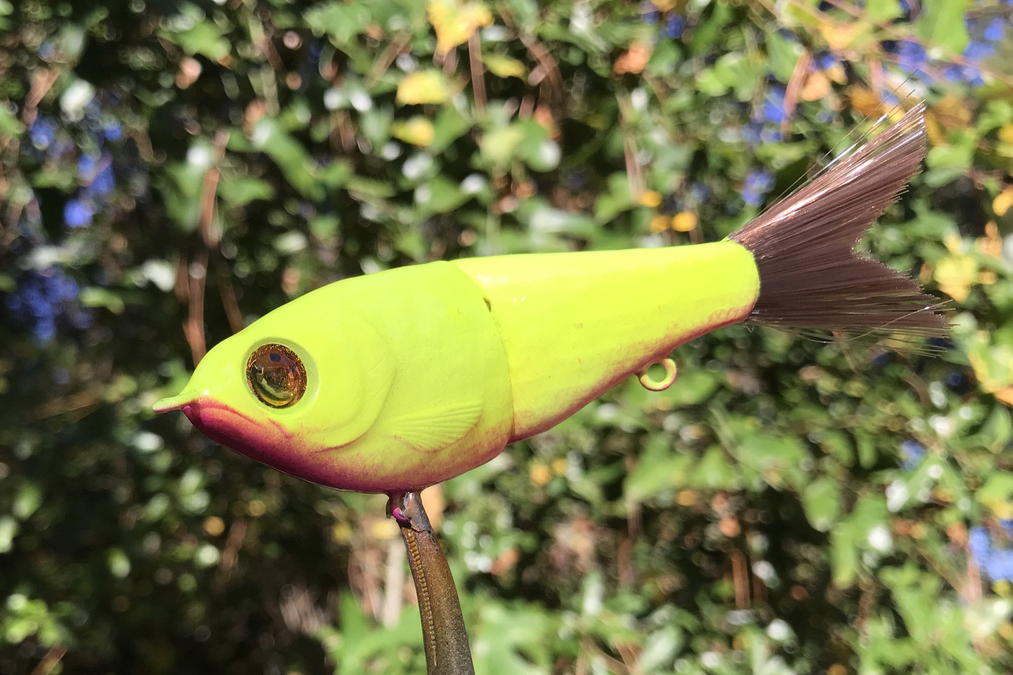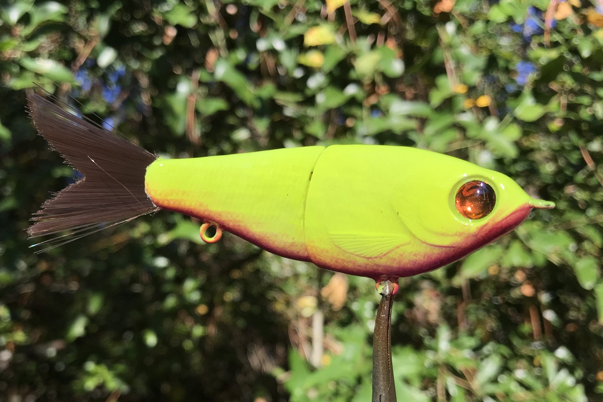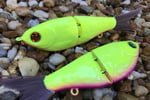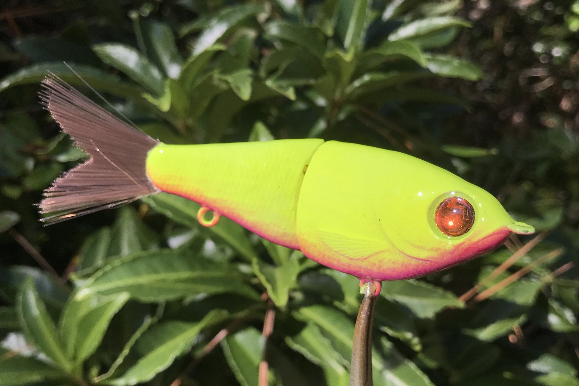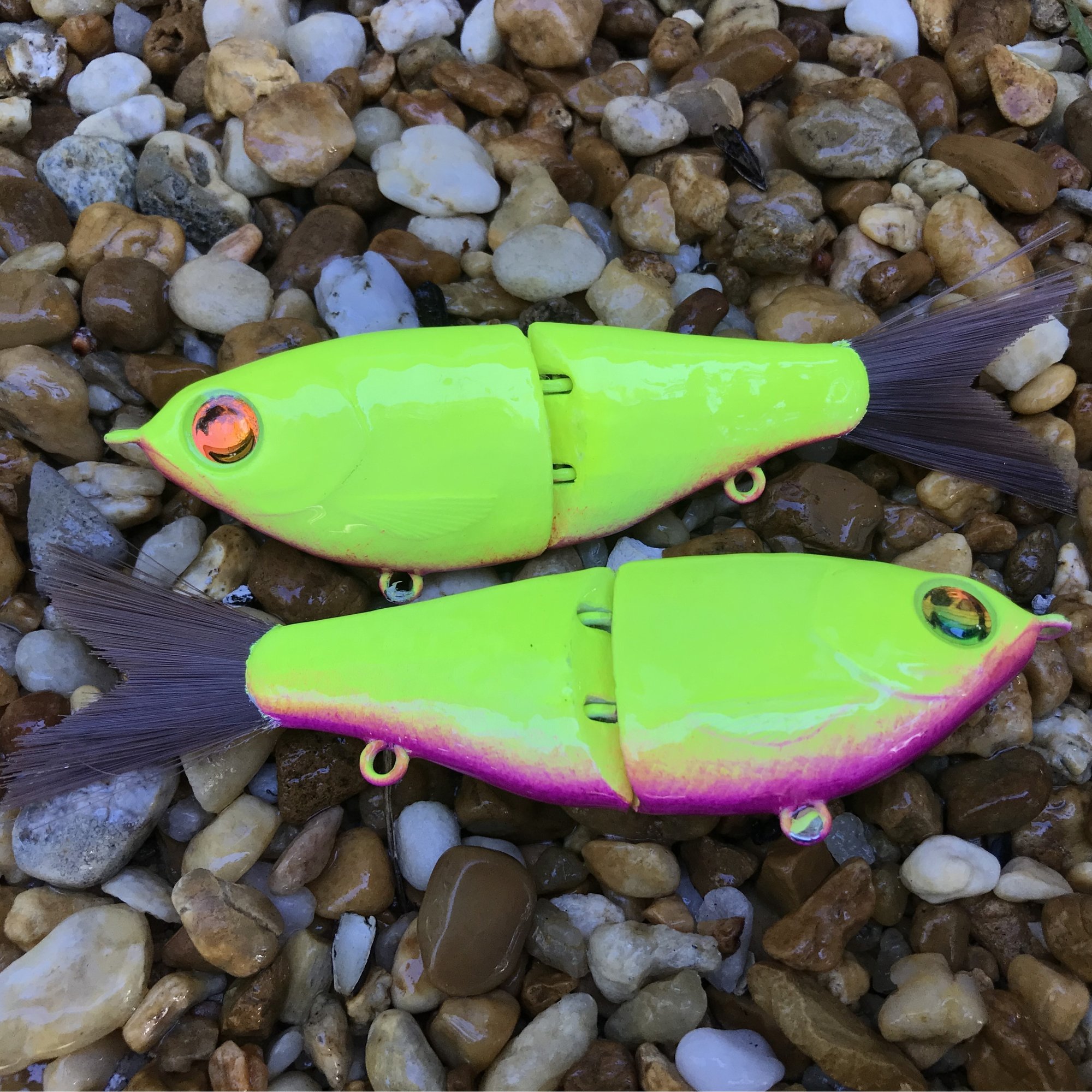 This finesse glide bait features custom eyes, neon paints, #4 VMC hooks, and high gloss 3X UV resin topcoat. I can upgrade to larger #2 hooks upon request. This is a great starter glide bait, light enough to throw with a worm rod and lethal action.
