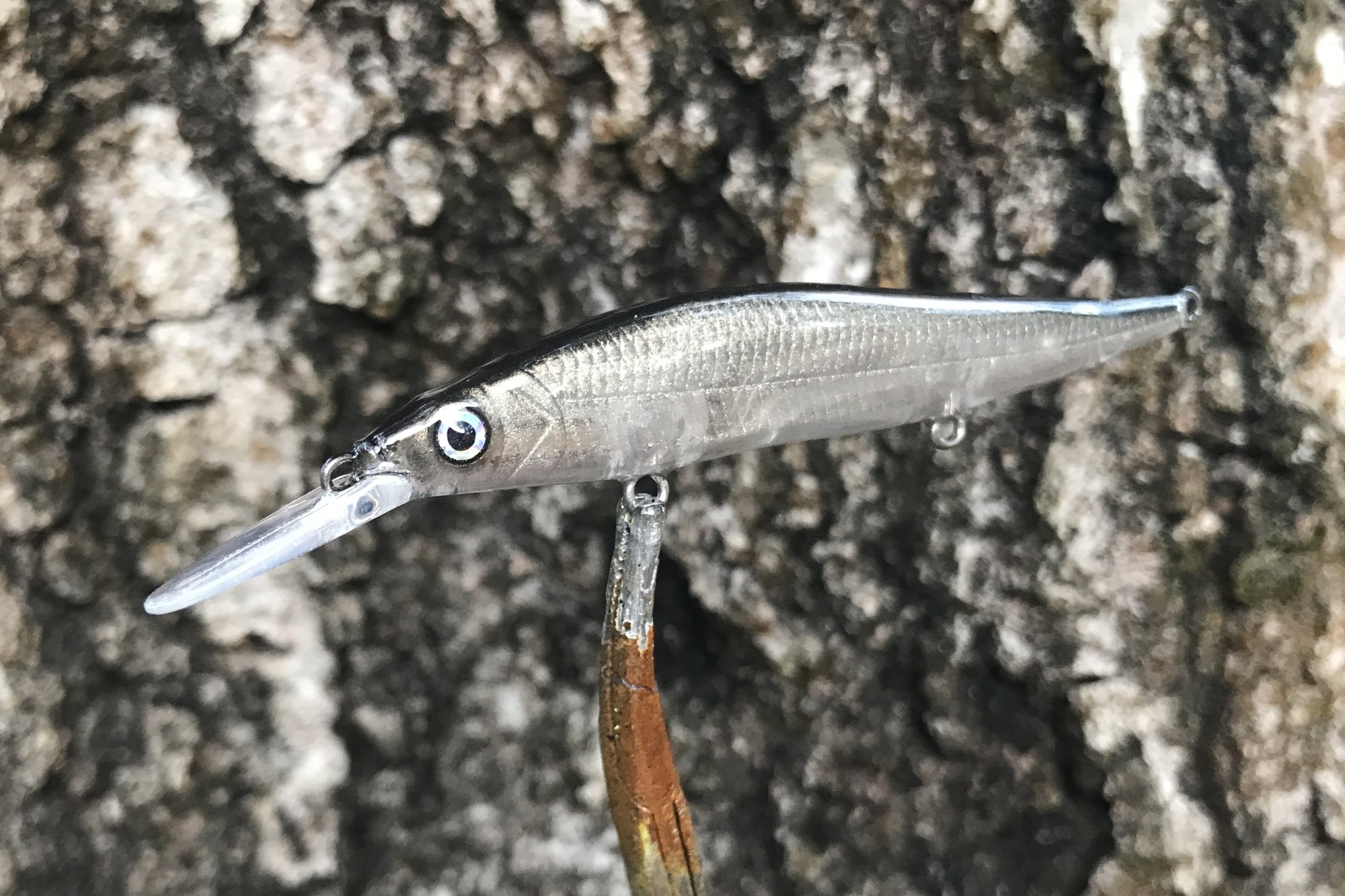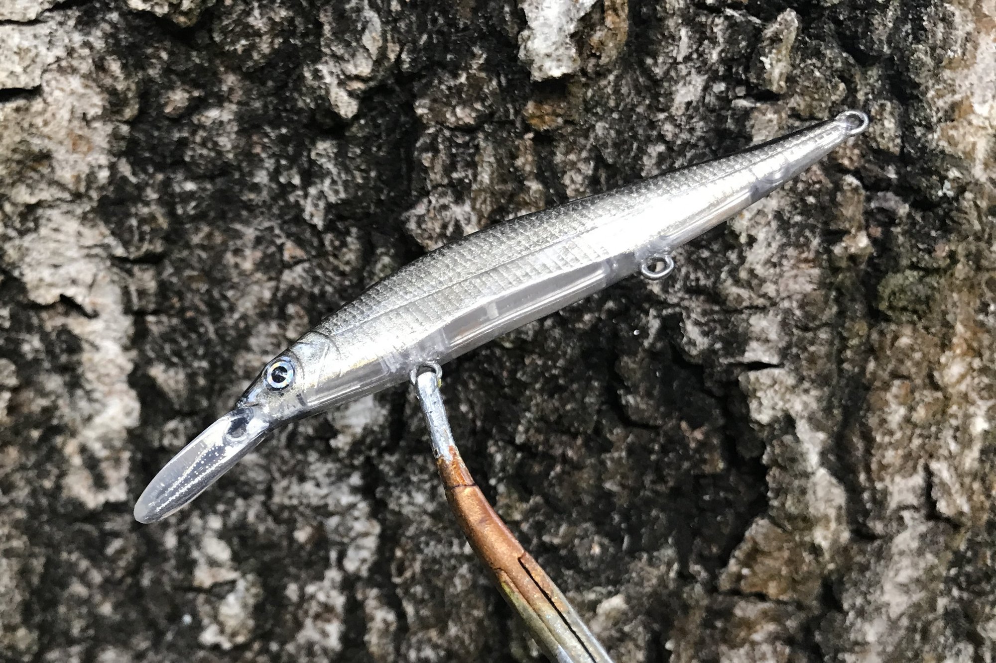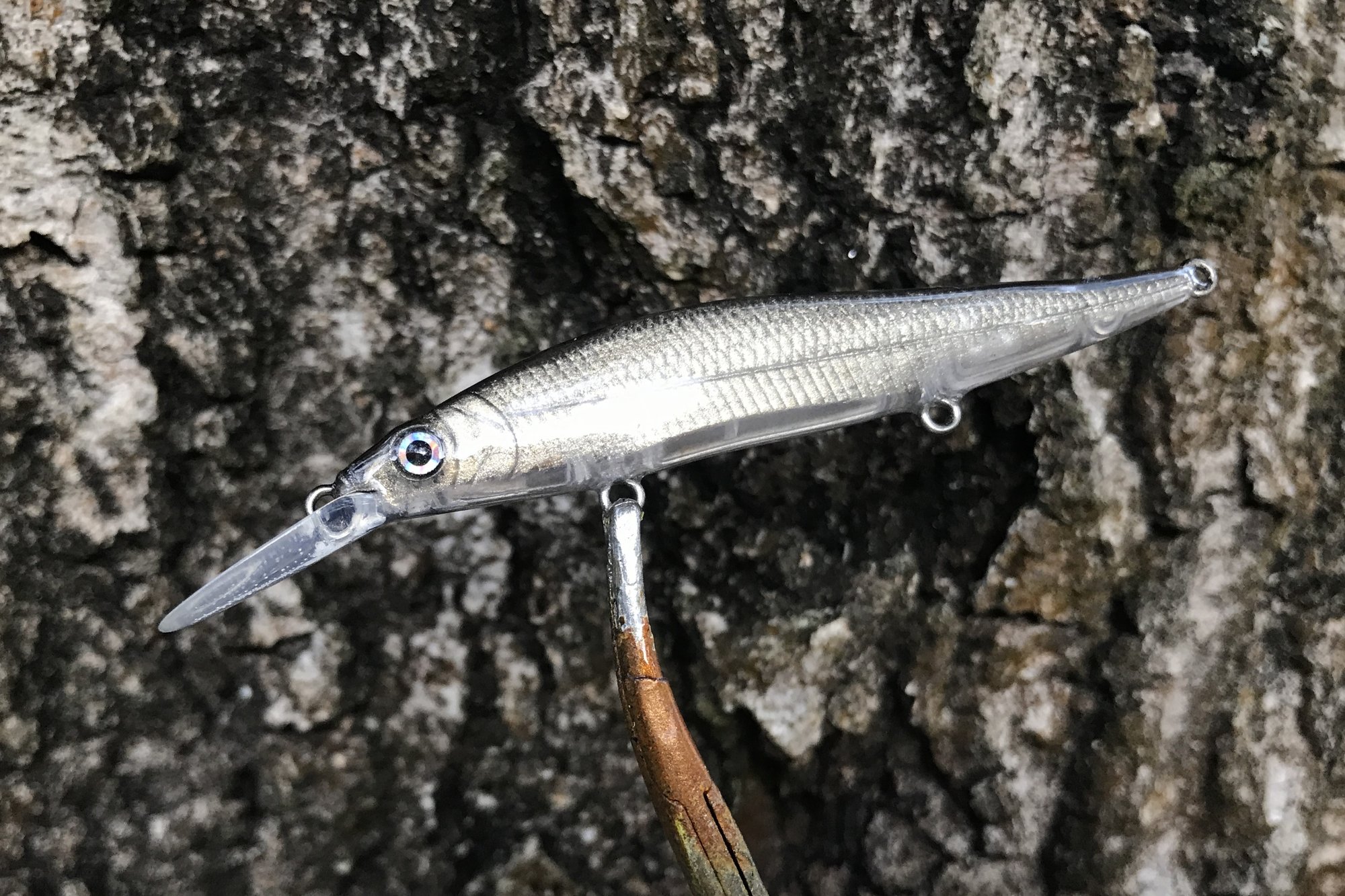 My Glass series features custom metallic blends, VMC #12 trebles and a high gloss 2X RHC clearcoat. Sinking bait, tank tested. This is the smallest bait in the 110 line, comparison pic shows 110 standard and 110 mini.