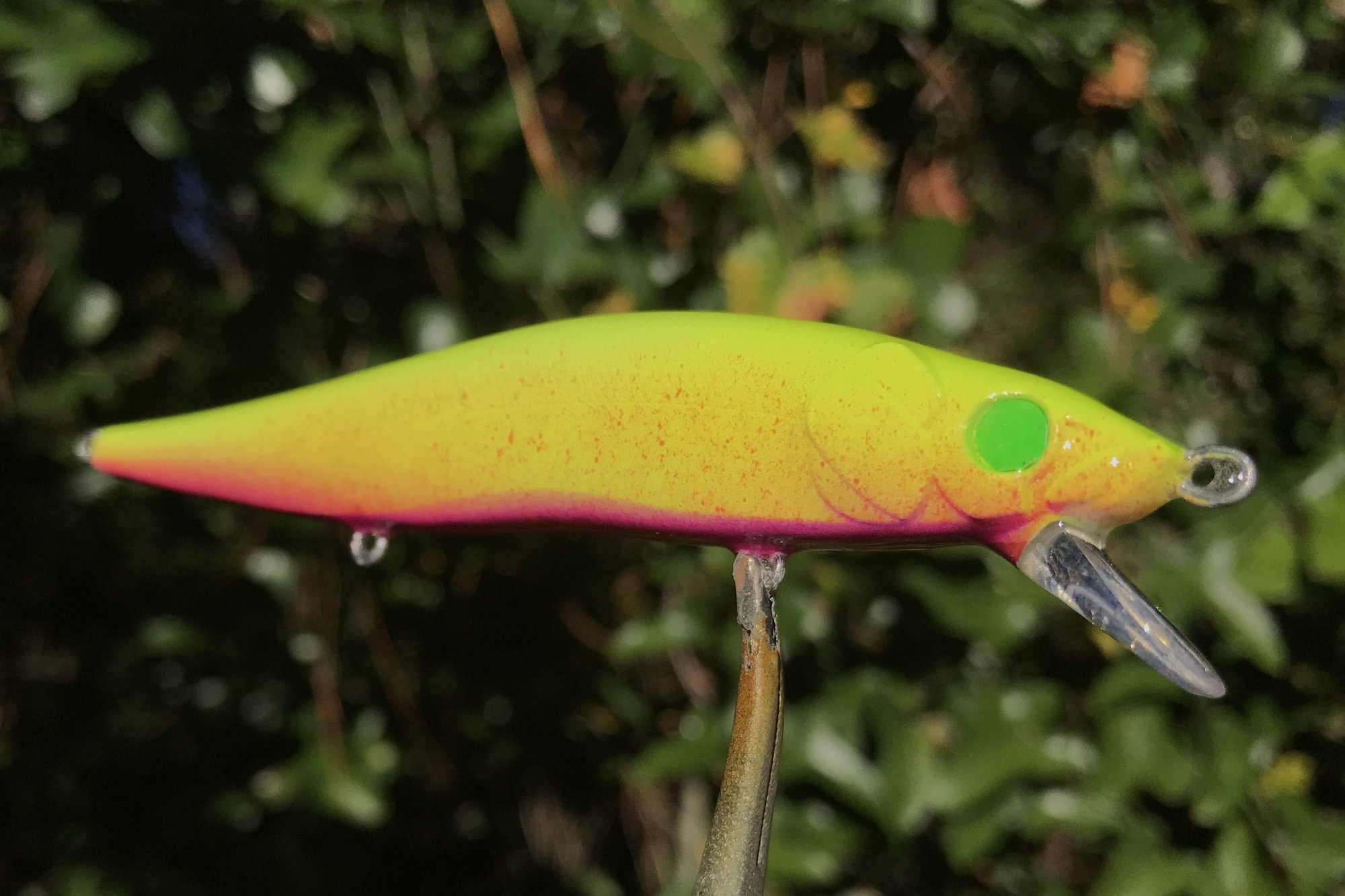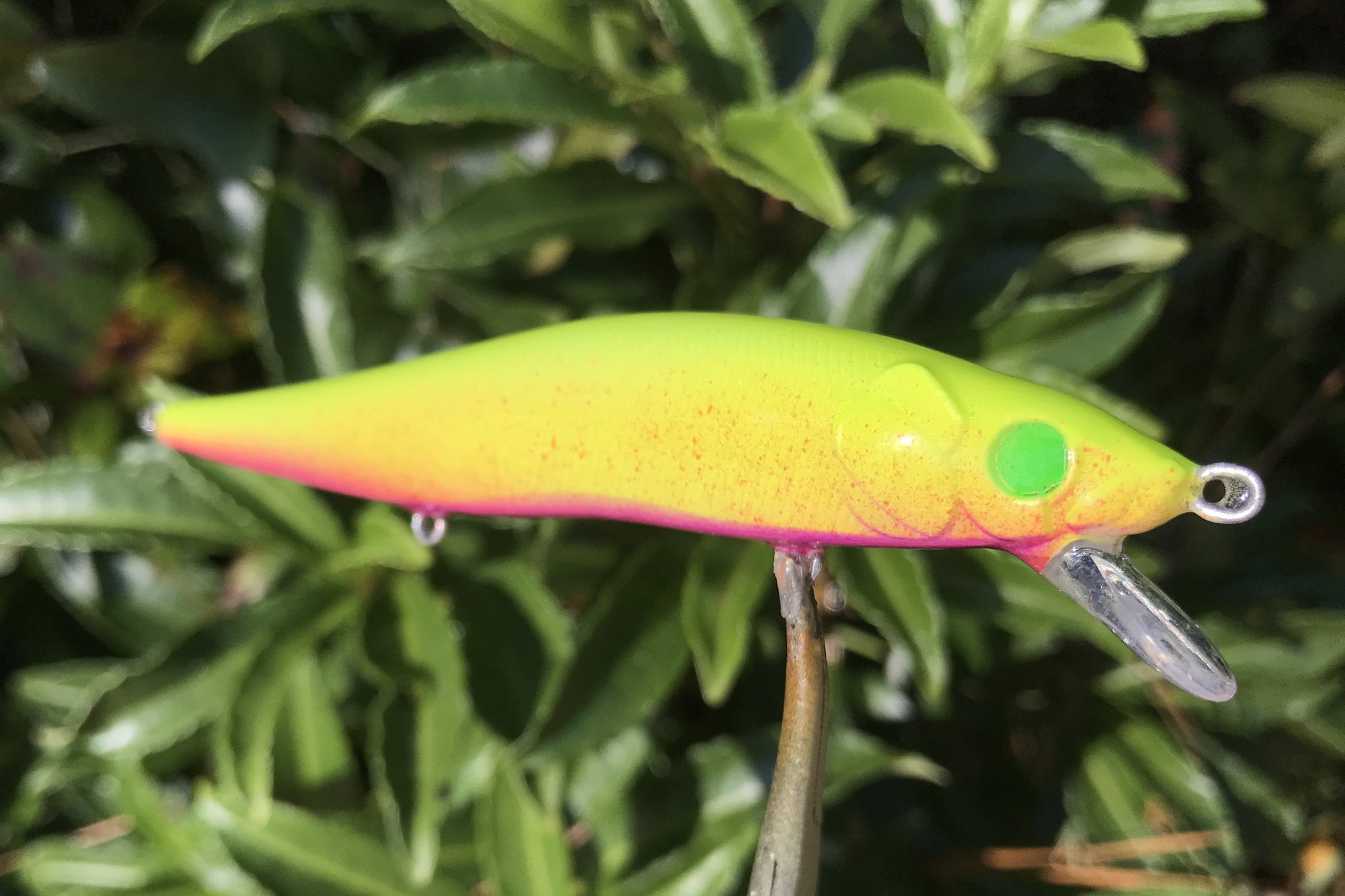 My PINK LEMONADE series features custom eyes, neon paints premium Mustad KVD triple grip #6 trebles and a high gloss 2X RHC clearcoat. Suspending bait, tank tested.