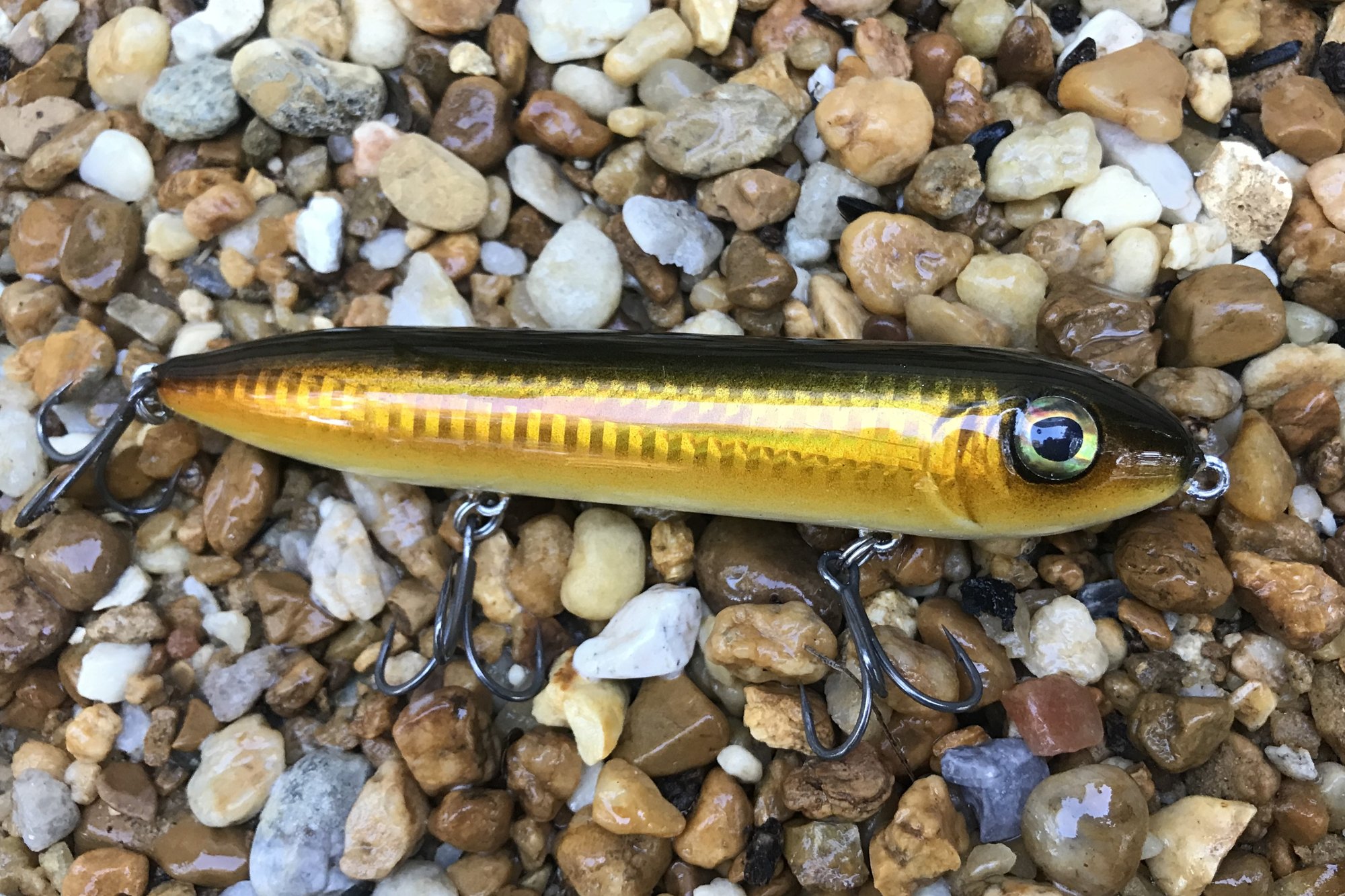 This listing is for one SPOOK CLONE. Each bait is hand painted with great care and attention to detail. Most feature custom eyes made by me and decals unique to each bait. Baits are finished with multiple layers of resin or premium marine grade clearcoat and cured in Florida sunshine.