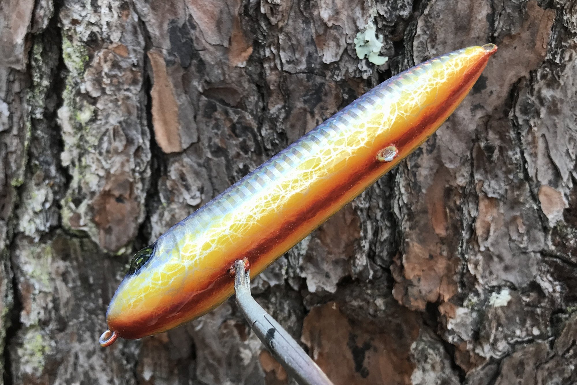 My ICW features, custom eyes, colorshift paints, #4 Pro Grade 2X trebles and a 2X high gloss UV resin topcoat. Similar to a Super Spook.