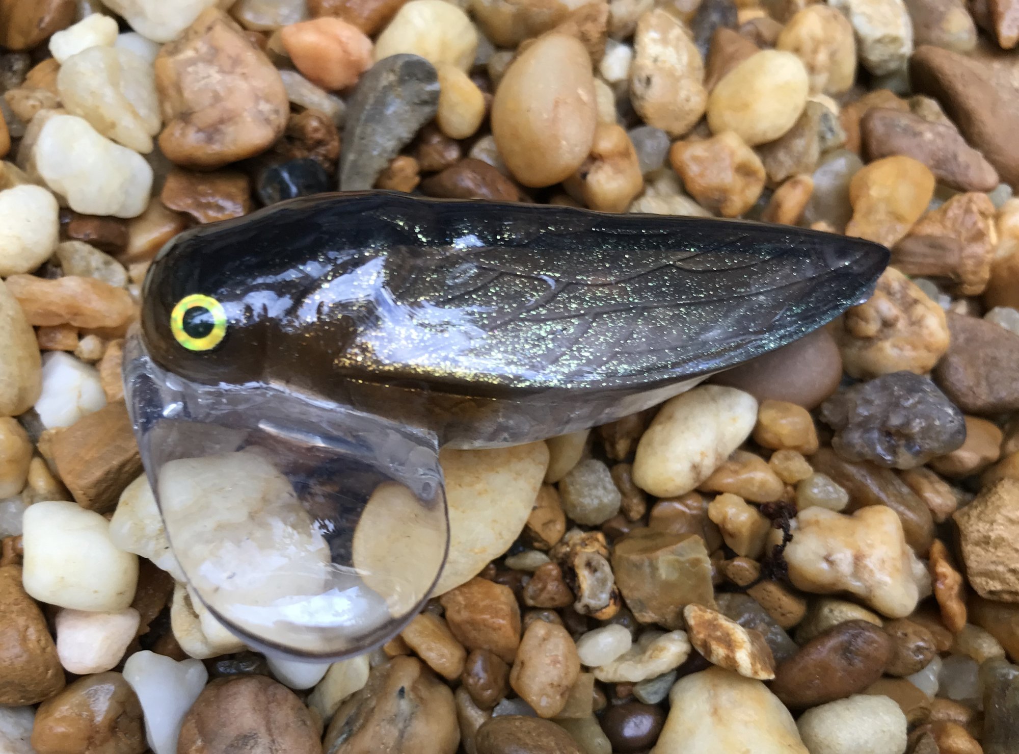 My Topwater CICADA features, custom eyes, metallic fades, #4 VMC trebles and a 2X high gloss UV resin topcoat.